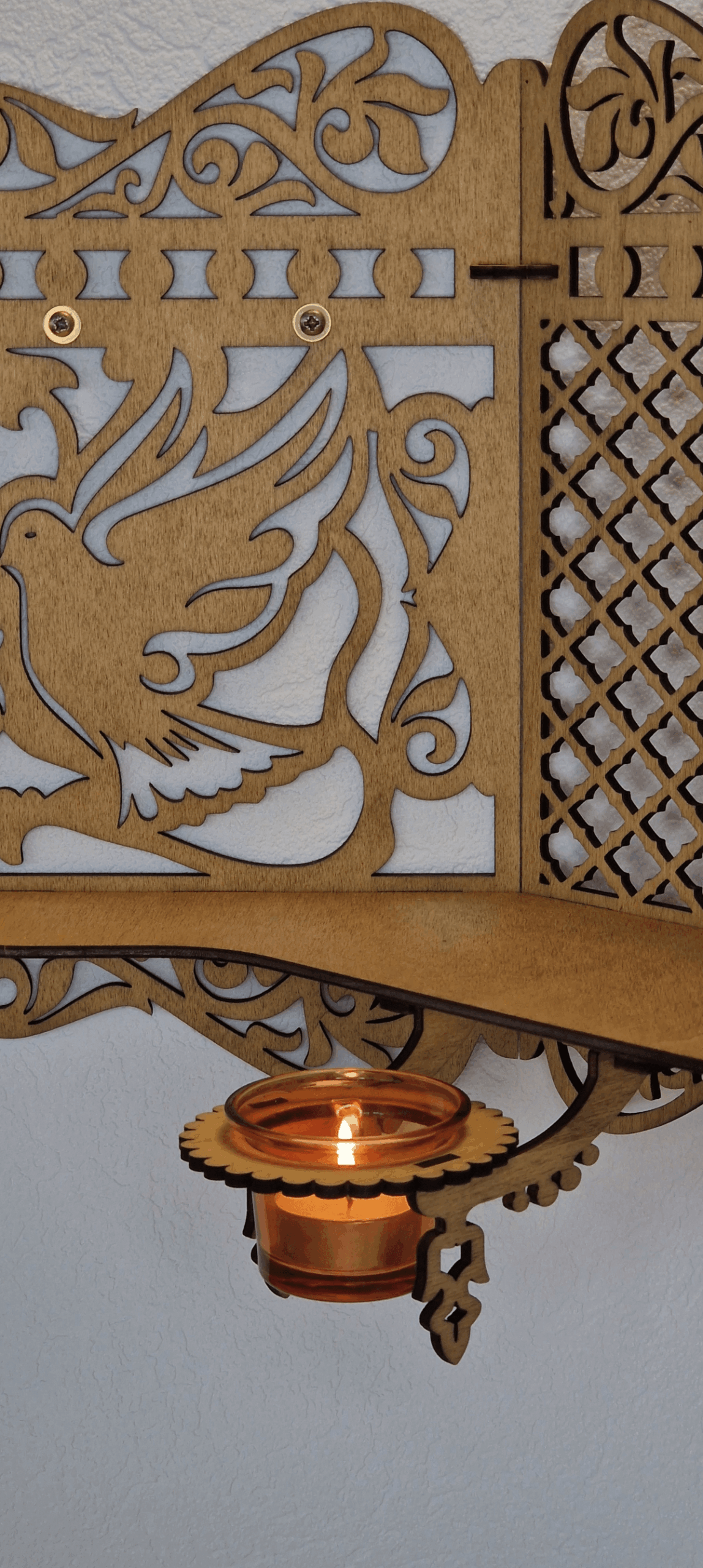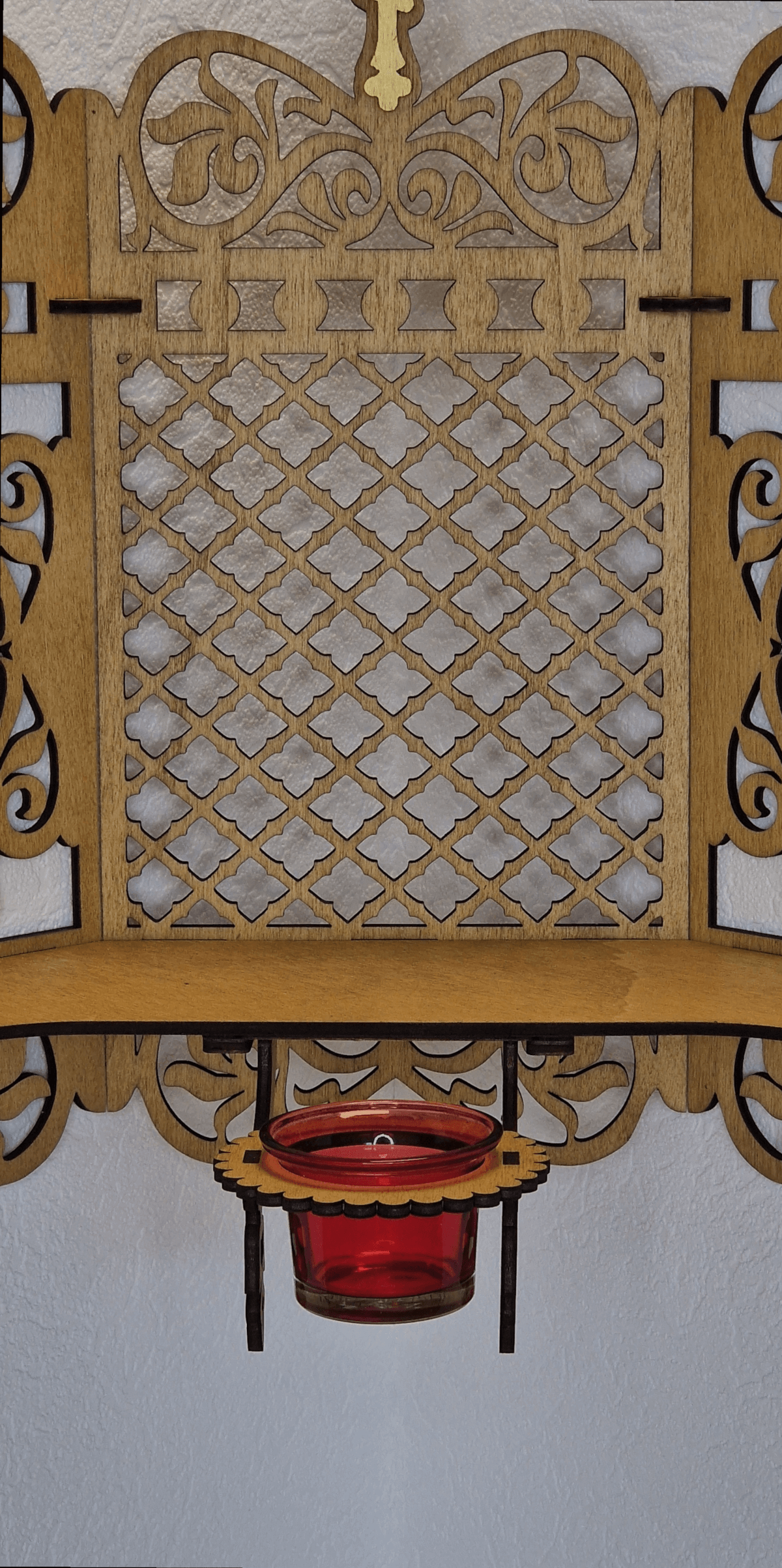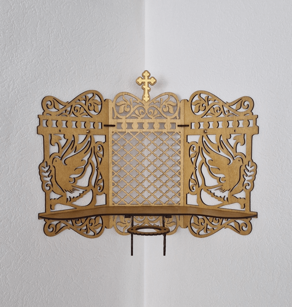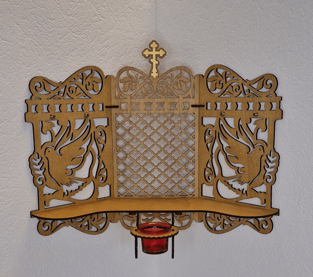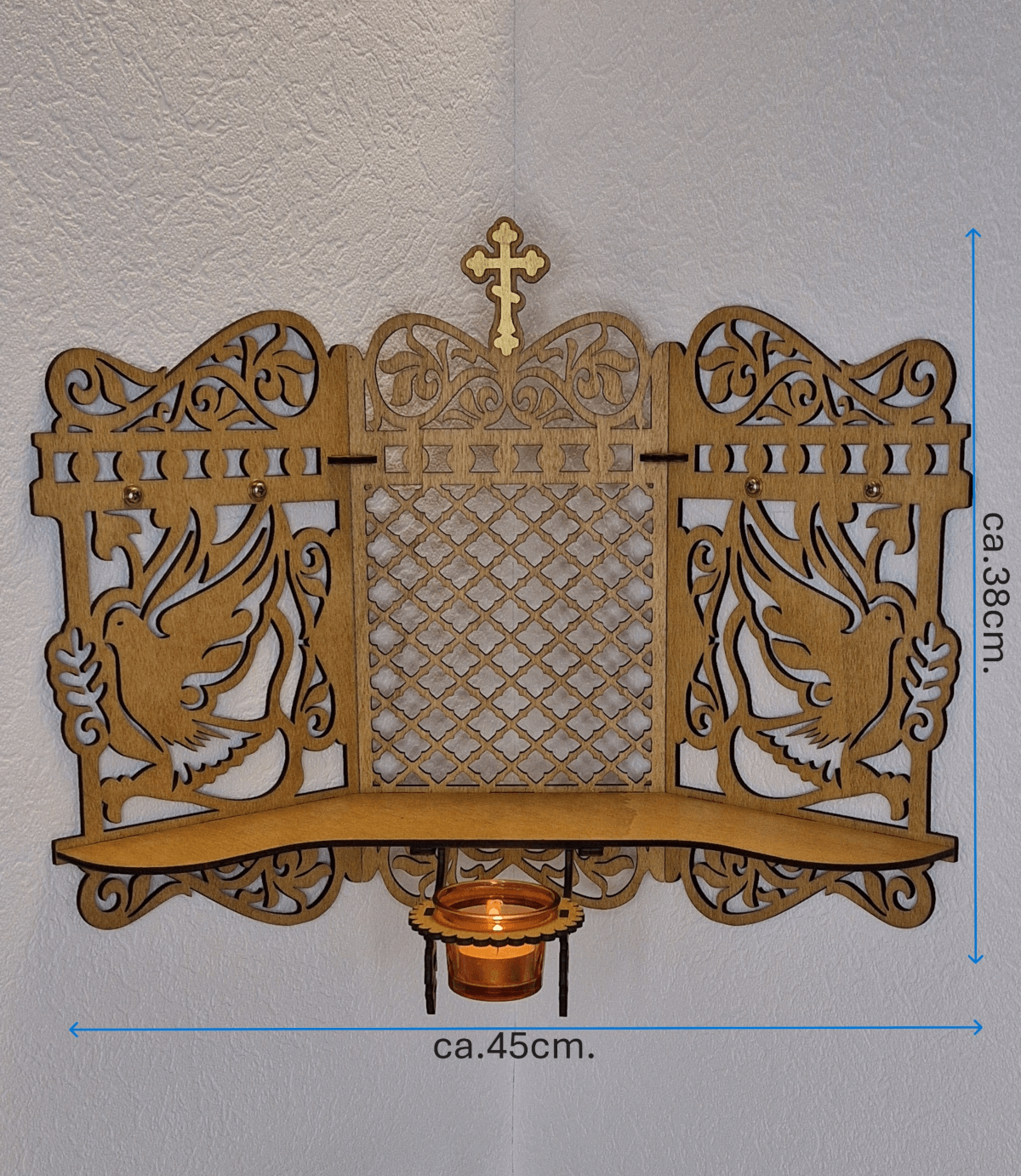 Verwandeln Sie eine stille Ecke Ihres Zuhauses in einen Ort des Gebets mit diesem liebevoll handgefertigten orthodoxen Eckikonenostase. Jedes Stück ist ein Unikat – individuell für Sie gefertigt.