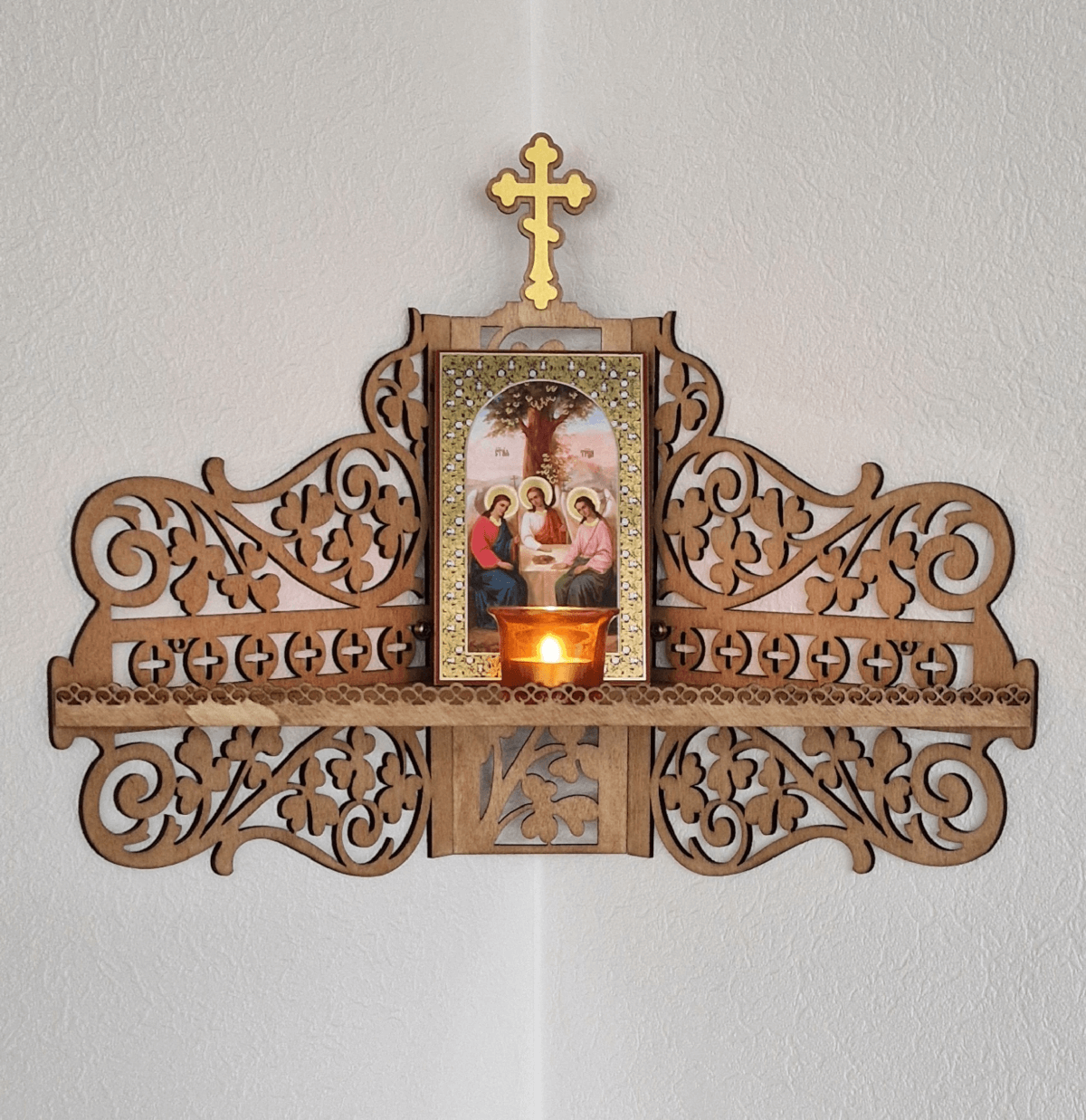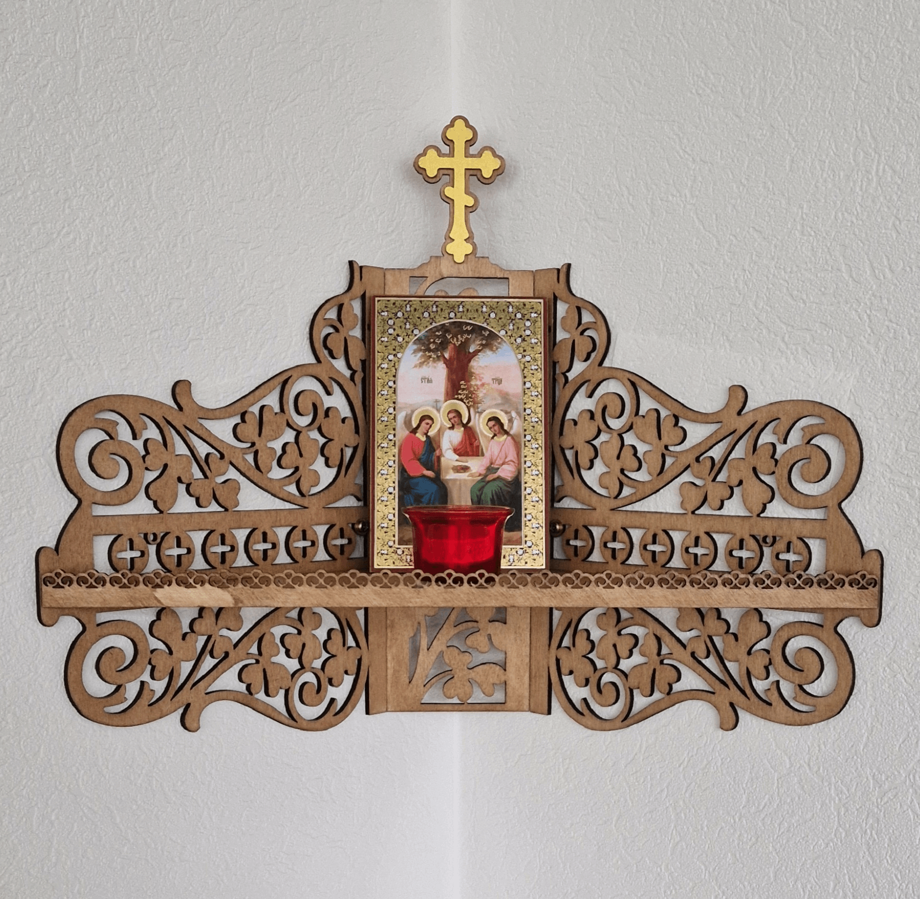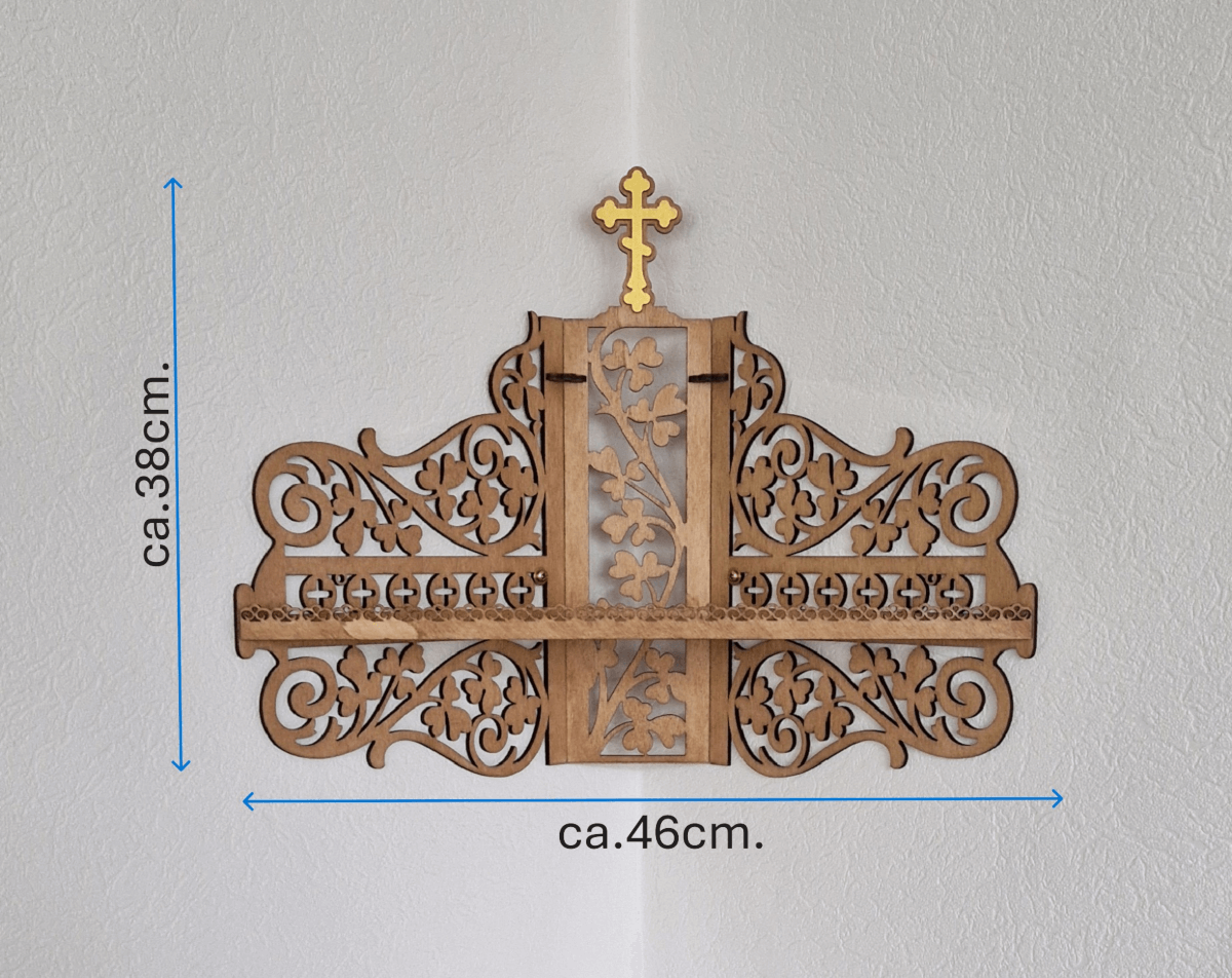 Verwandeln Sie eine stille Ecke Ihres Zuhauses in einen Ort des Gebets mit diesem liebevoll handgefertigten orthodoxen Eckikonenostase. Jedes Stück ist ein Unikat – individuell für Sie gefertigt.